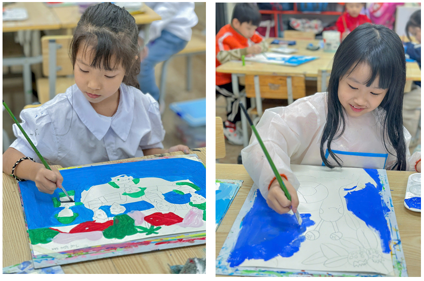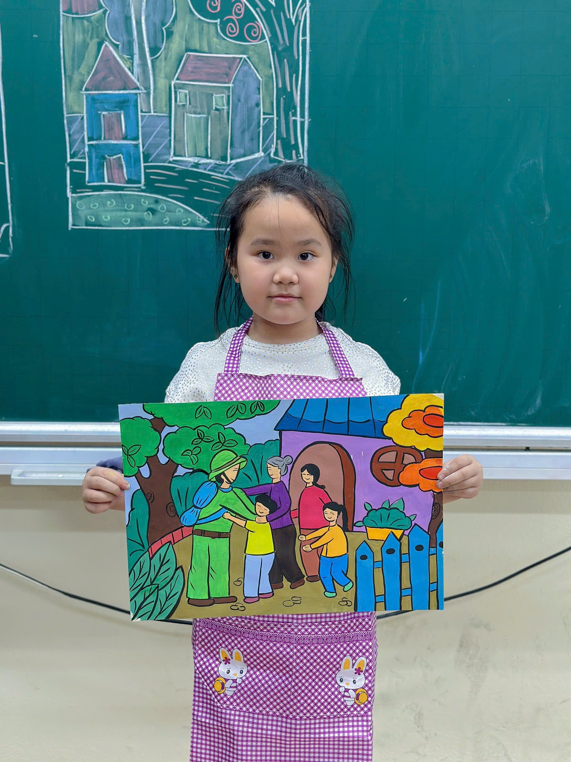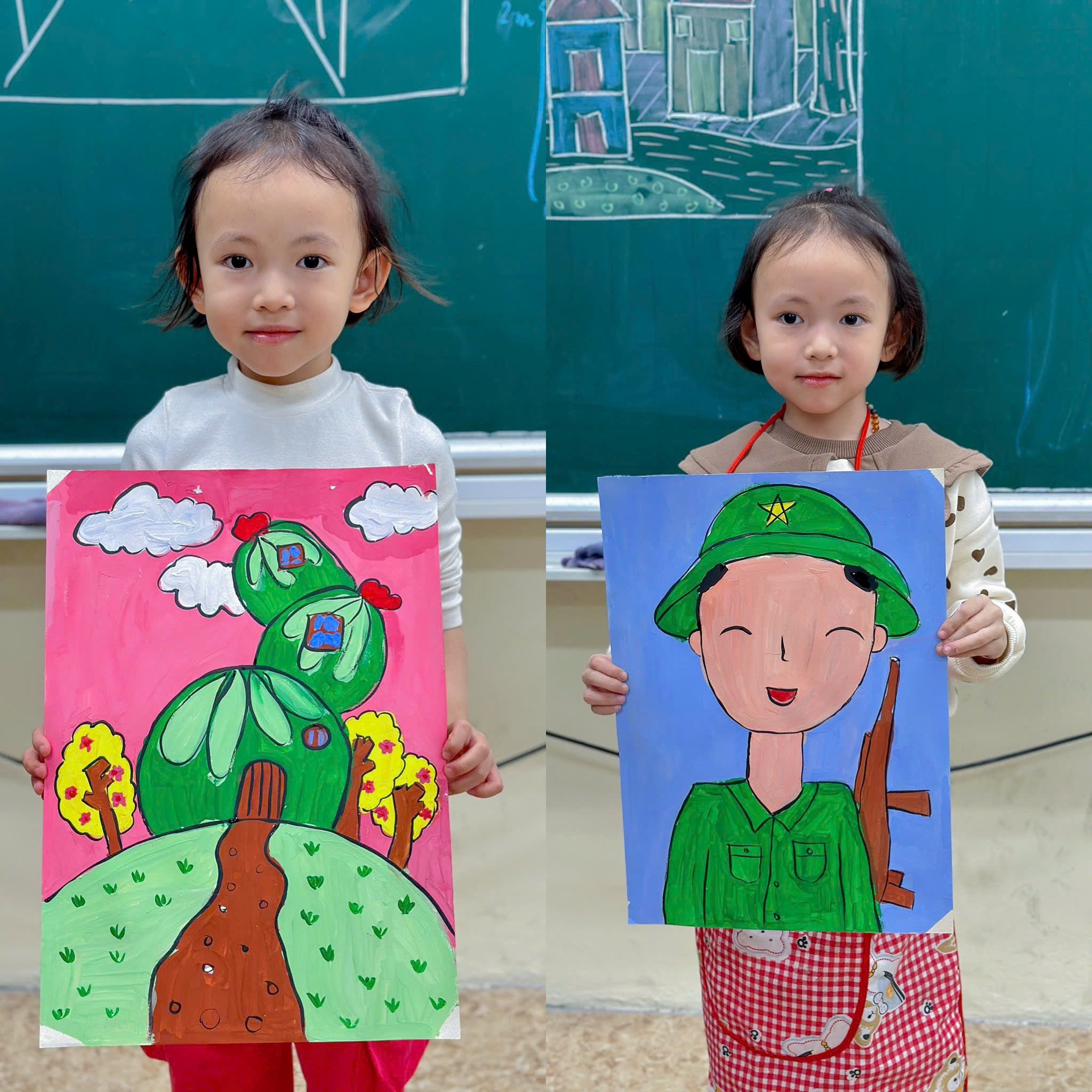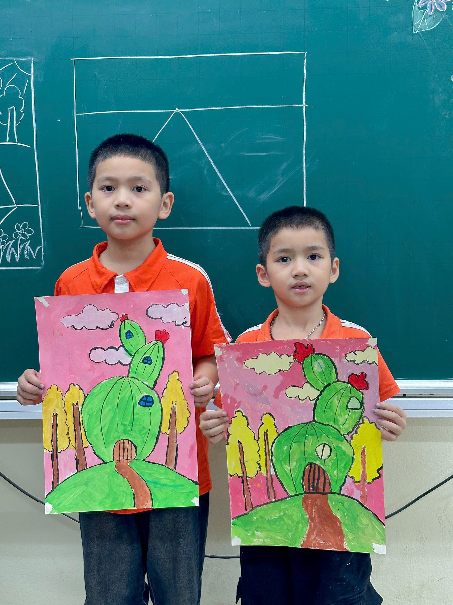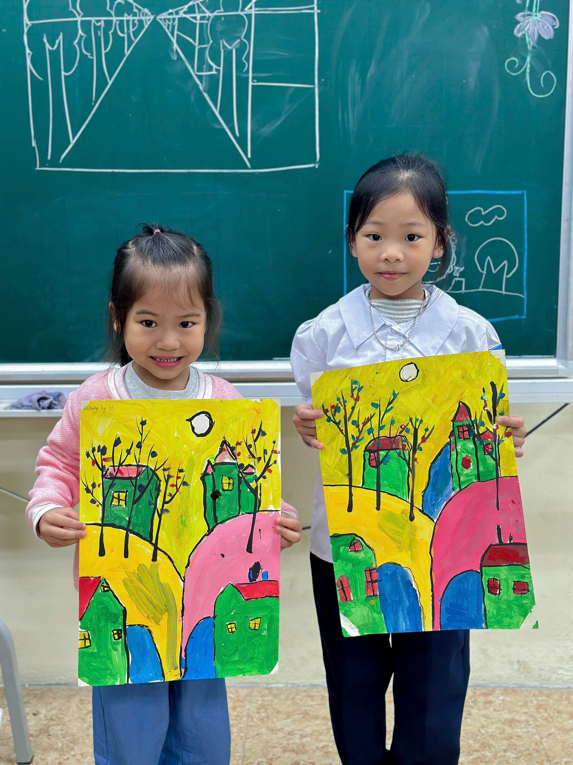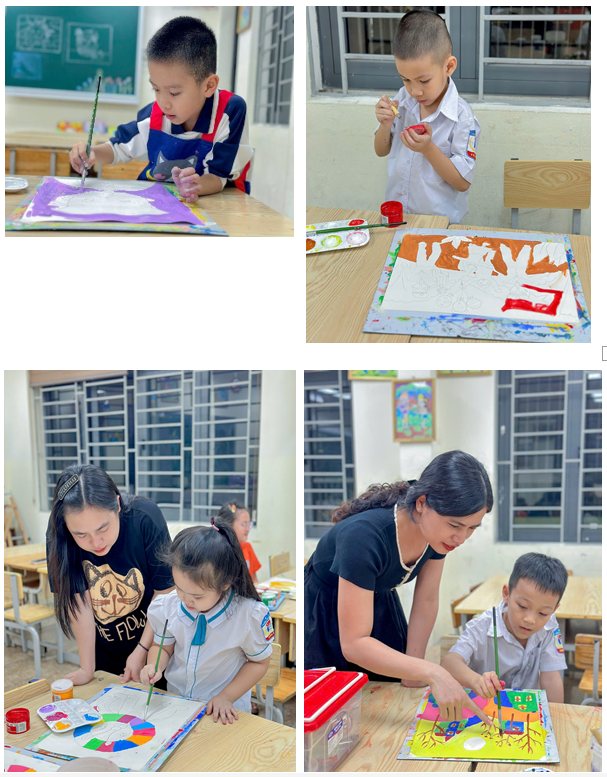 Đôi khi chân tay, mặt mũi, áo quần có lấm lem màu vẽ nhưng niềm say mê vẫn đọng trong đáy mắt, những nụ cười luôn nở trên môi. Trong thời gian ngắn, cô giáo sẽ gợi ý chủ đề, hướng dẫn kĩ thuật và các mẹo nhỏ để bức vẽ đẹp hơn.