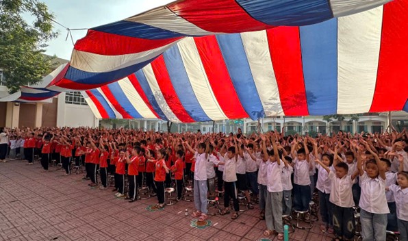 Để khuấy động không khí, toàn bộ học sinh đã cùng tham gia màn nhảy dân vũ vui tươi, sôi động. Tiết mục này không chỉ giúp các em thêm hứng khởi mà còn tạo sự gắn kết giữa các bạn học sinh với nhau.