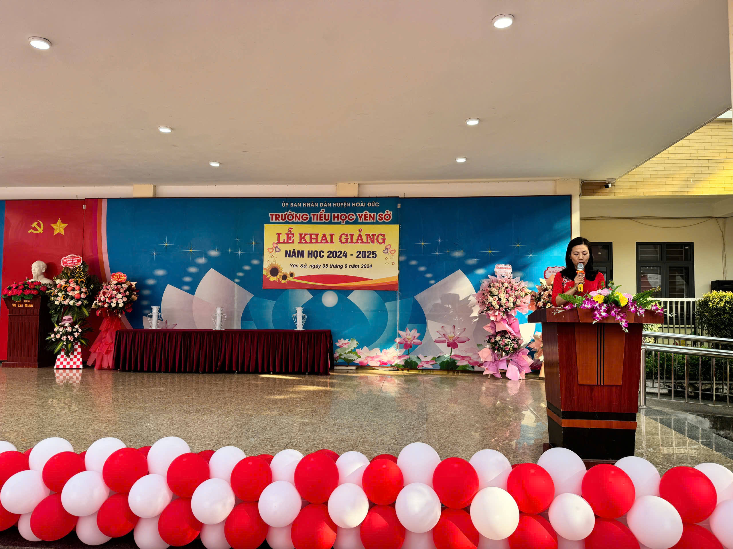 Cô giáo Phạm Thị Hà Hiệu trưởng nhà trước lên đọc diễn văn khai giảng và đánh trống khai trường