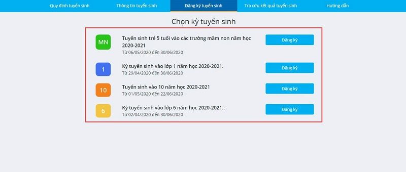 Bước 2: Chọn kỳ tuyển sinh vào lớp 1 và nhấn Đăng ký.