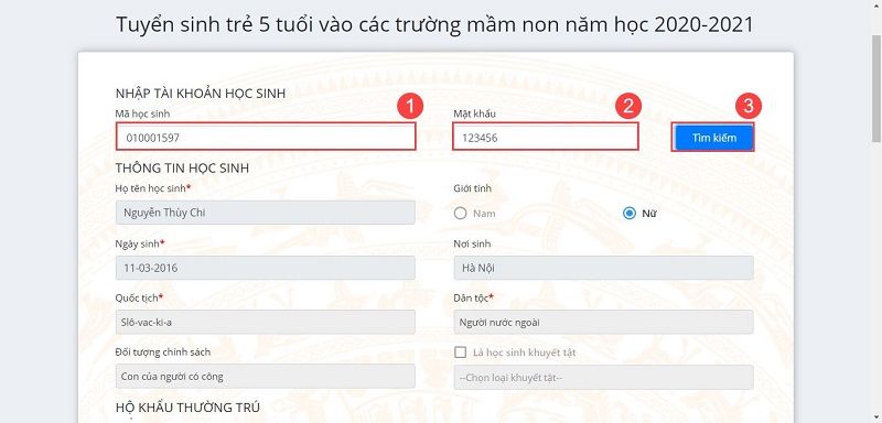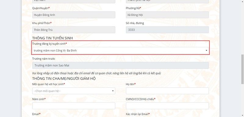 - Nếu thông tin về hộ khẩu thường trú và nơi ở hiện tại không chính xác, phụ huynh vui lòng liên hệ cơ sở giáo dục cũ để chỉnh sửa hoặc đợi đến thời gian mở tuyển sinh trực tiếp mang hồ sơ tới trường để đăng ký tuyển sinh.