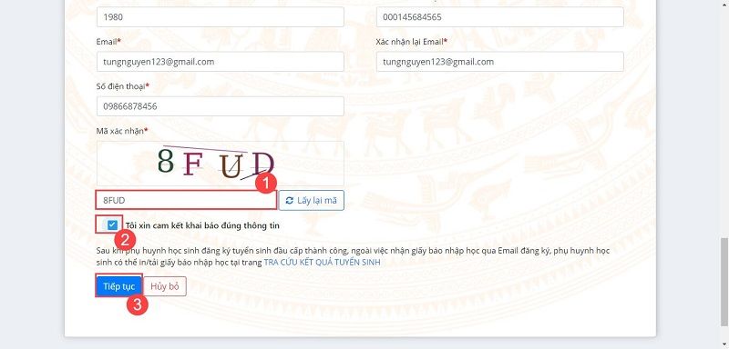 Bước 5: Phụ huynh kiểm tra lại thông tin sau đó nhập mã xác nhận và tích chọn cam kết, nhấn Tiếp tục.