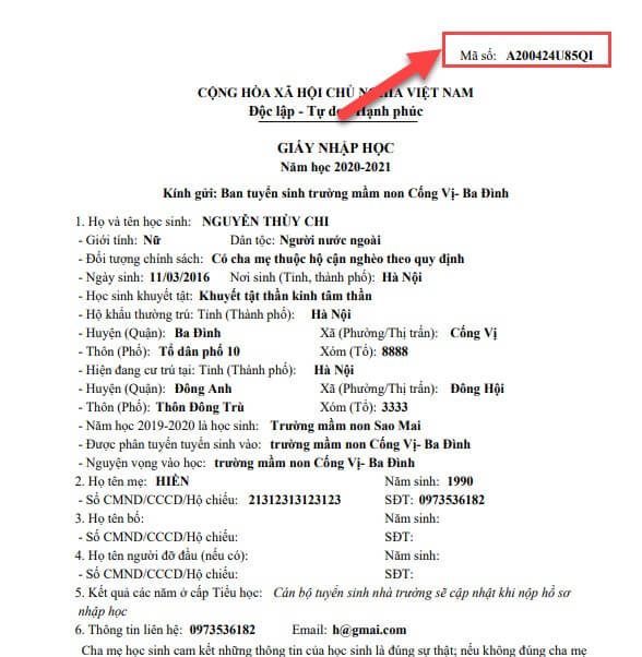 - Mã số đăng ký tuyển sinh trực tuyến: để đăng ký tuyển sinh trực tuyến vào lớp 1 CHMS nhất thiết phải có mã số đăng ký tuyển sinh trực tuyến (do trường mầm non trên địa bàn thành phố Hà Nội cấp); mỗi mã số CMHS chỉ được đăng ký tuyển sinh trực tuyến một lần. Trường hợp đăng ký tuyển sinh trực tuyến vào các trường mầm non CMHS không cần phải nhập mã số đăng ký tuyển sinh trực tuyến.