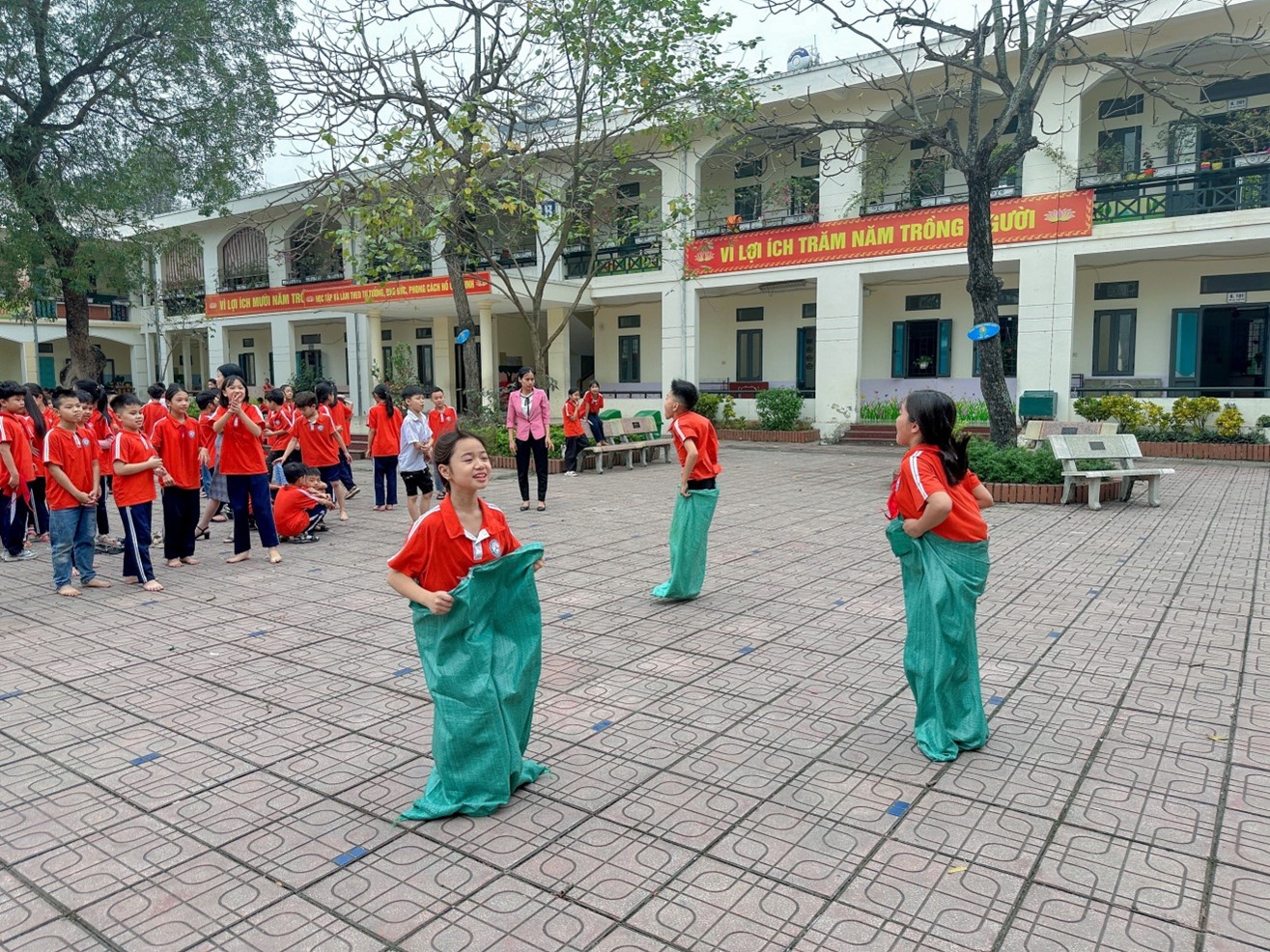 Học sinh khối 4 tham gia trò chơi “Nhảy bao bố”
