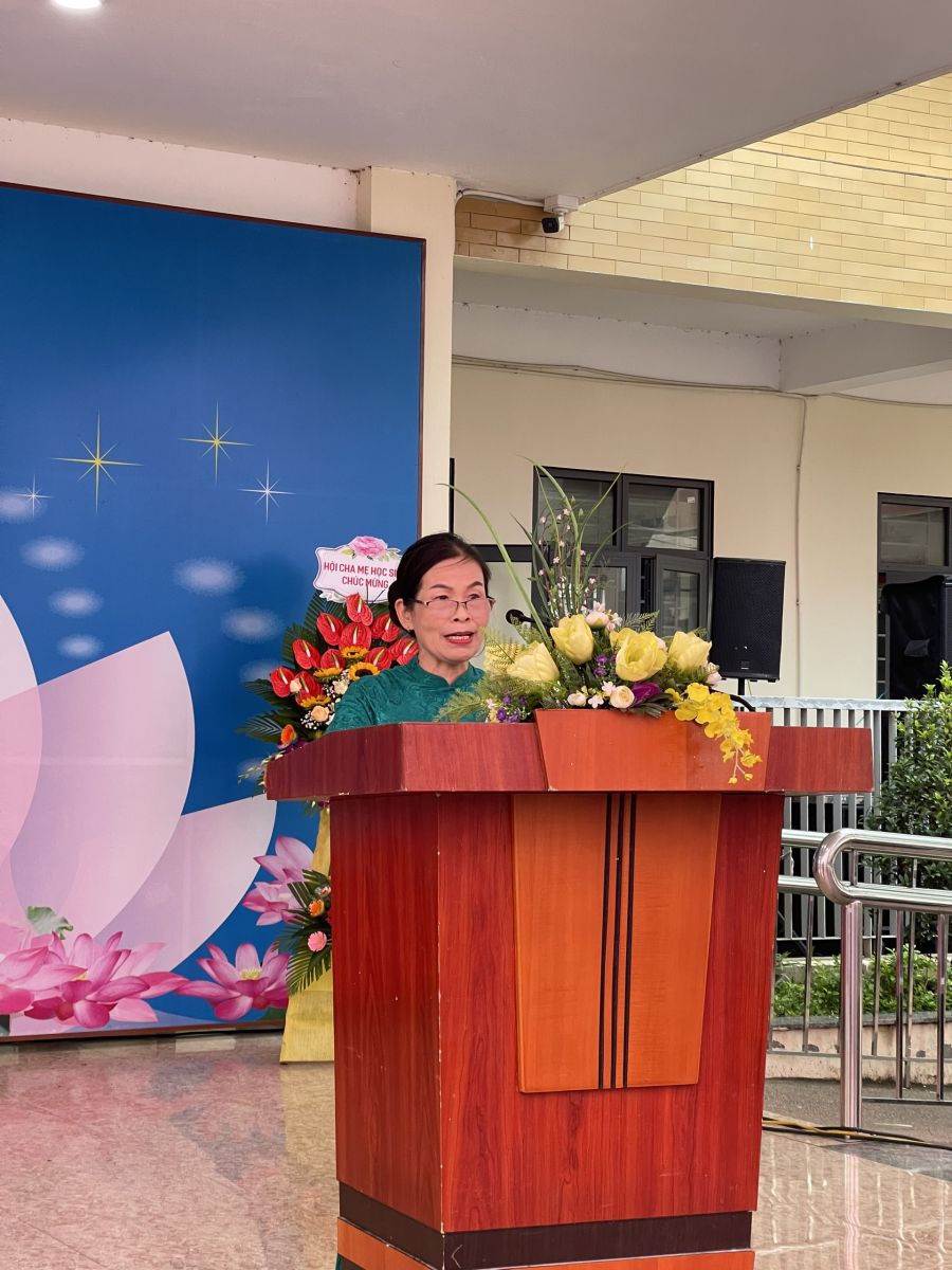 Bà Nguyễn Thị Phương Hoa - đại diện cha mẹ HS phát biểu và tặng quà lưu niệm