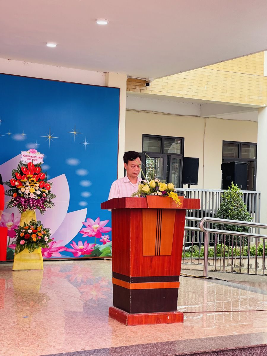 Ông Nguyễn Tín Thành - Phó Bí thư đảng ủy phát biểu và tặng hoa nhà trường