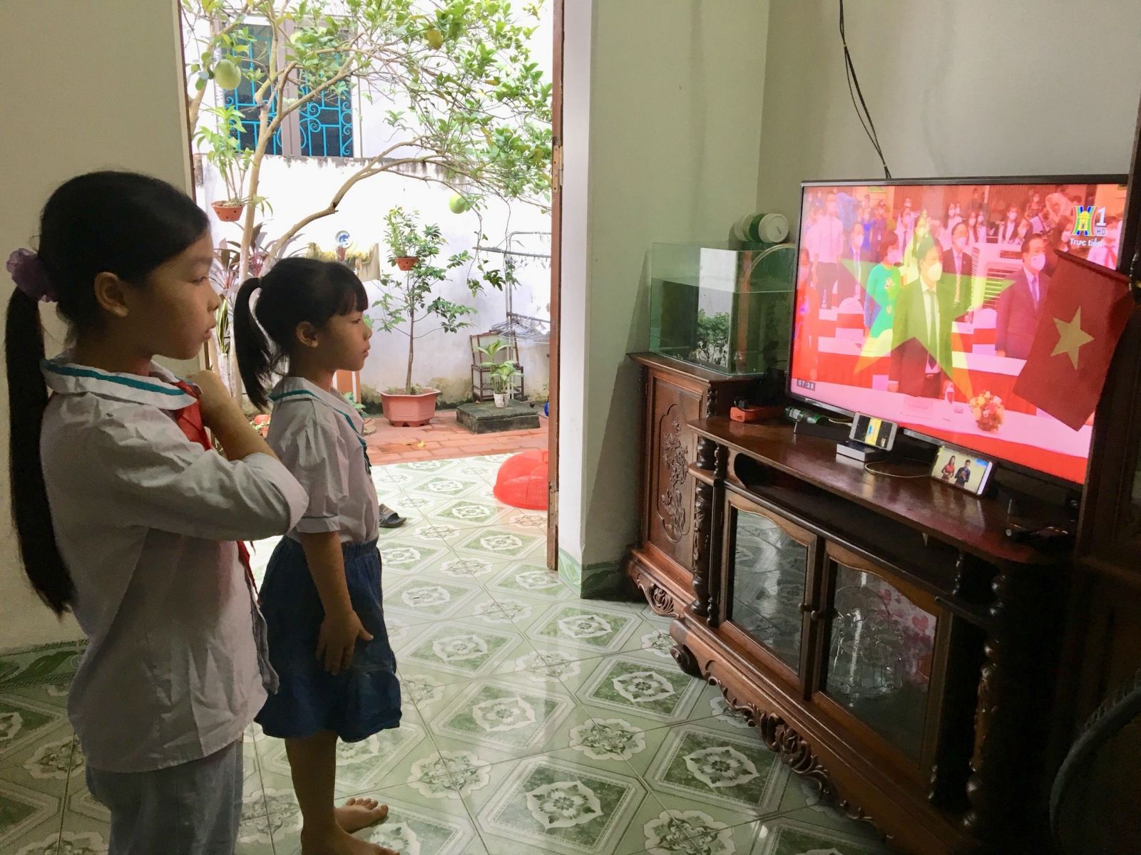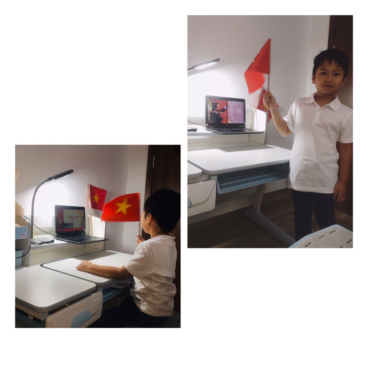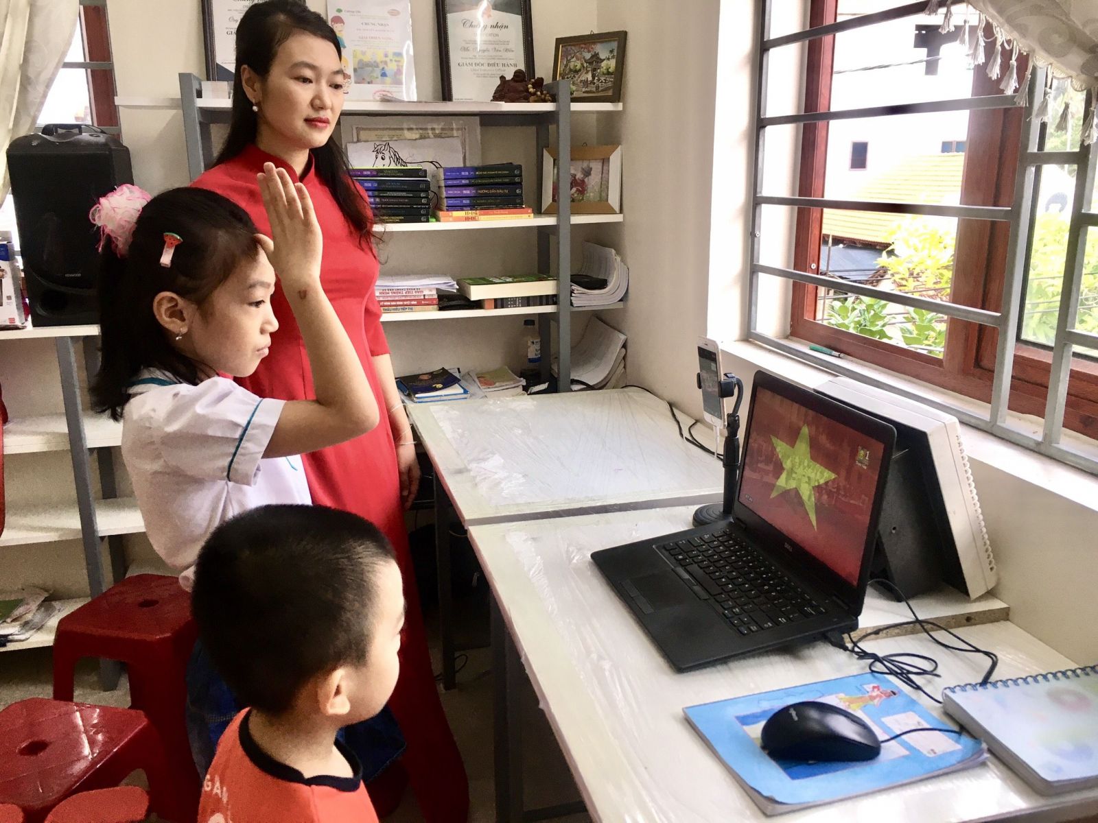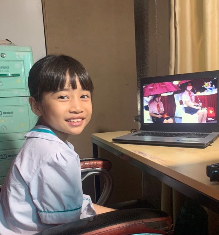 Với bộ đồng phục gọn gàng, tư thế nghiêm trang, gương mặt rạng ngời, các con hòa mình trong không khí long trọng của phần lễ chào cờ. Lời bài hát quốc ca vẫn ngân vang, đầy tự hào về truyền thống kiên cường của dân tộc, như chưa từng có bất kì đại dịch bệnh nào xảy ra.
