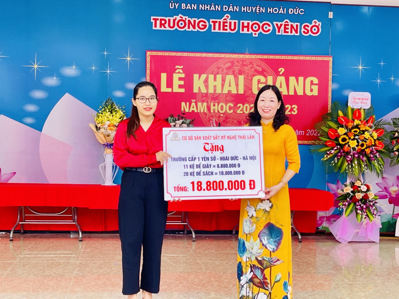 Bên cạnh những bó hoa tươi thắm, trường Tiểu học Yên Sở còn được đón nhận tình cảm, những món quà của Liên đoàn lao động huyện Hoài Đức dành tặng các em học sinh con cán bộ giáo viên là công đoàn viên khó khăn trong các nhà trường.
