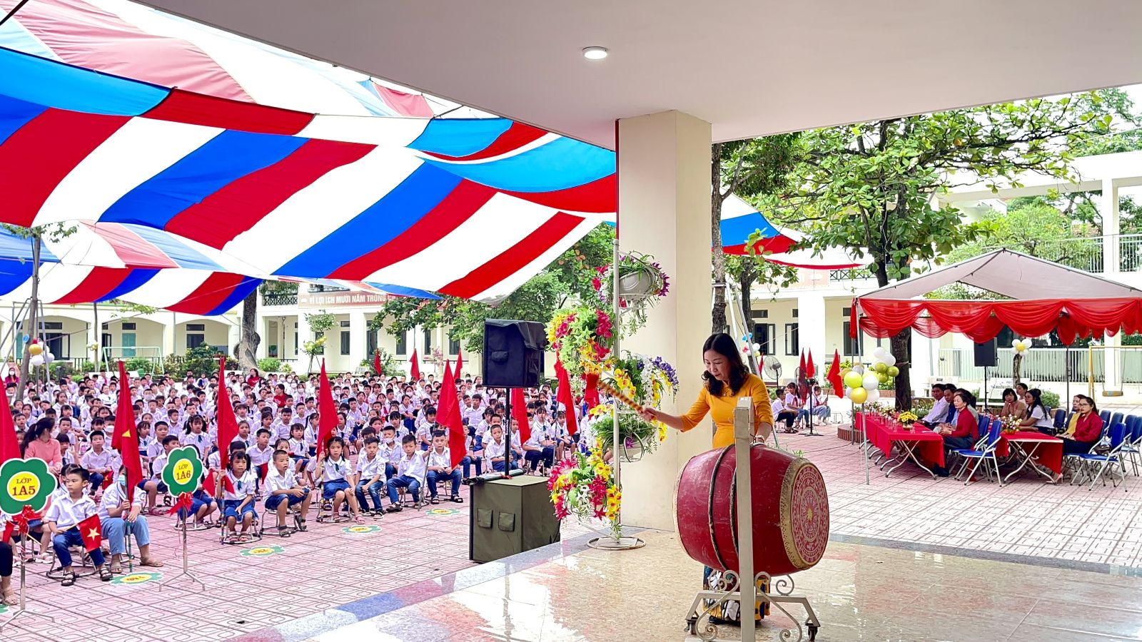 Năm học mới đã bắt đầu, toàn thể CBGVNV nhà trường đồng lòng, quyết tâm phấn đấu hoàn thành thắng lợi nhiệm vụ năm học 2022 – 2023. Cô giáo Phạm Thị Hà – Hiệu trưởng nhà trường đọc diễn văn khai giảng và đánh trống khai trường.