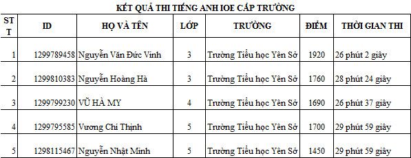 Ngày 4/12/2021 trường TH Yên Sở đã tiến hành tổ chức cho các em học sinh thi Olympic tiếng anh trực tuyến trên kênh https://ioe.vn vòng loại cấp trường. Vòng thi chính thức đã diễn ra nghiêm túc và thành công tốt đẹp.