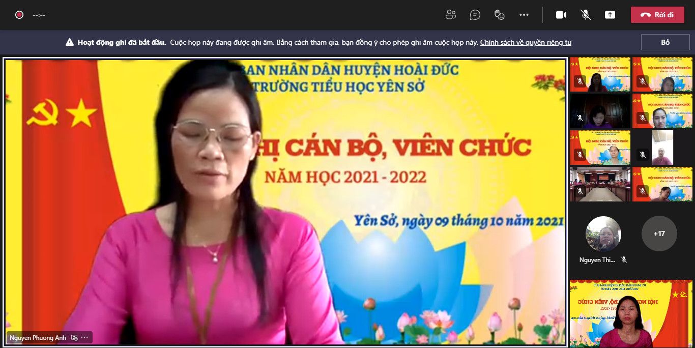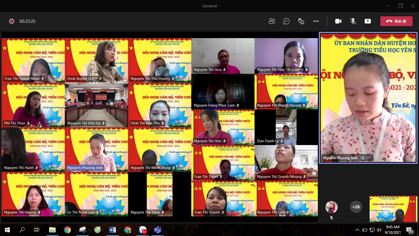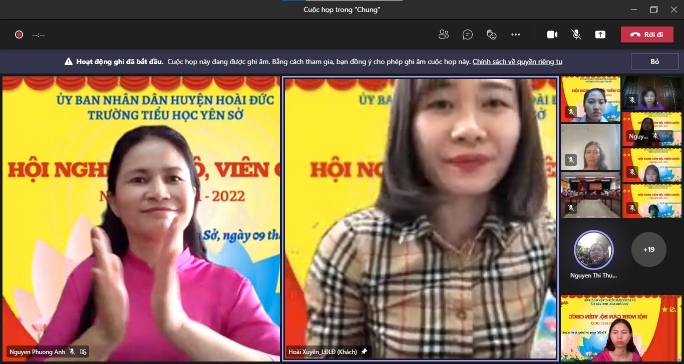 Hội nghị có sự tham gia đông đủ của tất cả cán bộ, giáo viên, nhân viên nhà trường qua hai hình thức trực tiếp tại trường Tiểu học Yên Sở và trực tuyến qua phần mềm Teams. Hội nghị rất vinh dự được chào đón đồng chí Đào Danh Lý - cán bộ phòng GD&ĐT, đồng chí Nguyễn Thị Hoài Xuyên đại diện cho LĐLĐ huyện Hoài Đức và các đồng chí đại biểu đại diện cho Đảng ủy và UBND xã Yên Sở: đồng chí Nguyễn Tín Thành - Phó bí thư thường trực Đảng ủy, đồng chí Nguyễn Bá Hoàn - Phó chủ tịch UBND xã.