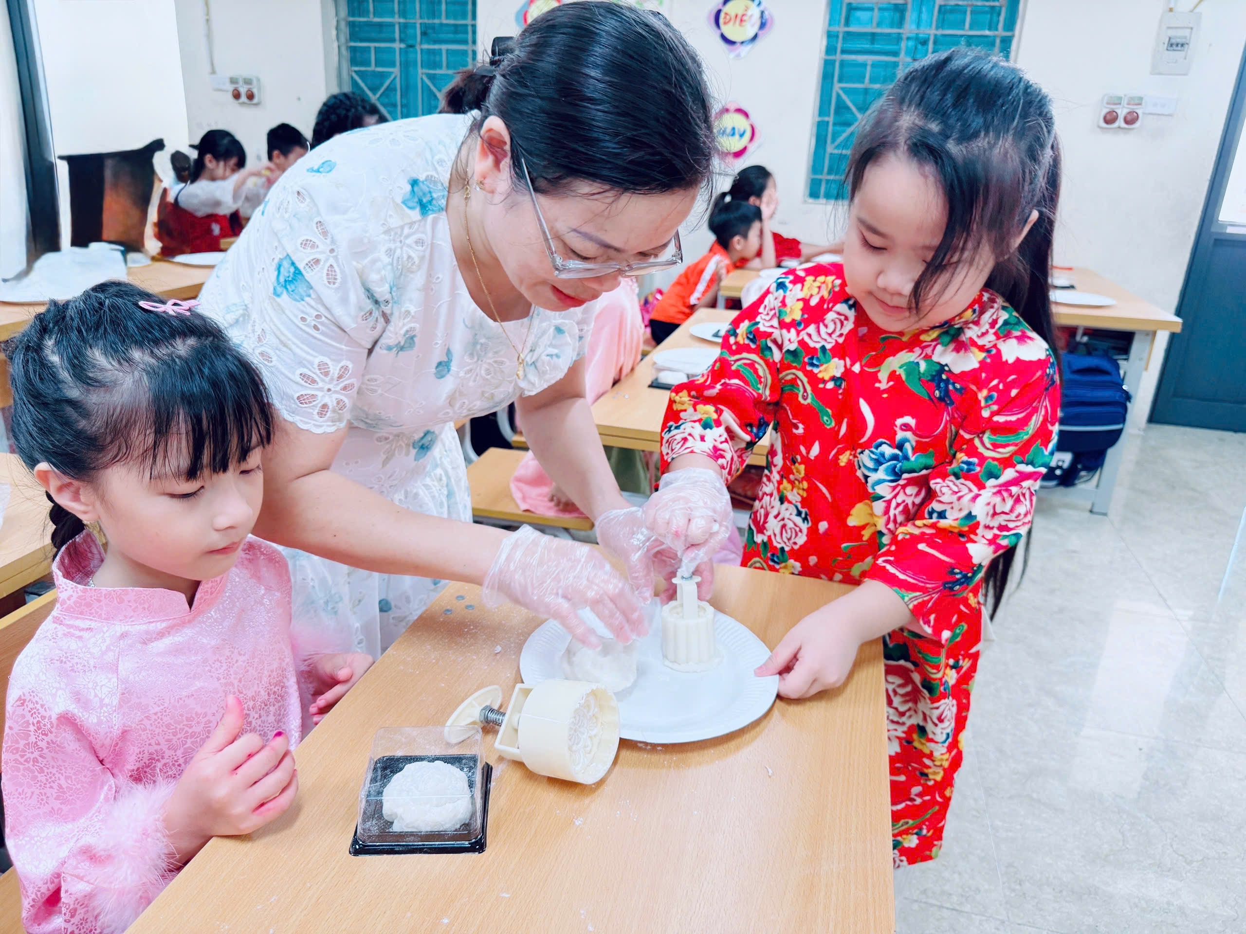 Ngay từ đầu chương trình, các em học sinh đã được trải nghiệm làm bánh dẻo – một trong những nét đẹp không thể thiếu của ngày Tết Trung thu. Từng chiếc bánh tròn trịa, ngọt ngào mang theo niềm vui háo hức của tuổi thơ. Tiếp đó, các lớp cùng nhau bày mâm cỗ trung thu, sáng tạo nên những mâm ngũ quả rực rỡ sắc màu, vừa đẹp mắt vừa thể hiện tinh thần đoàn kết, khéo léo.